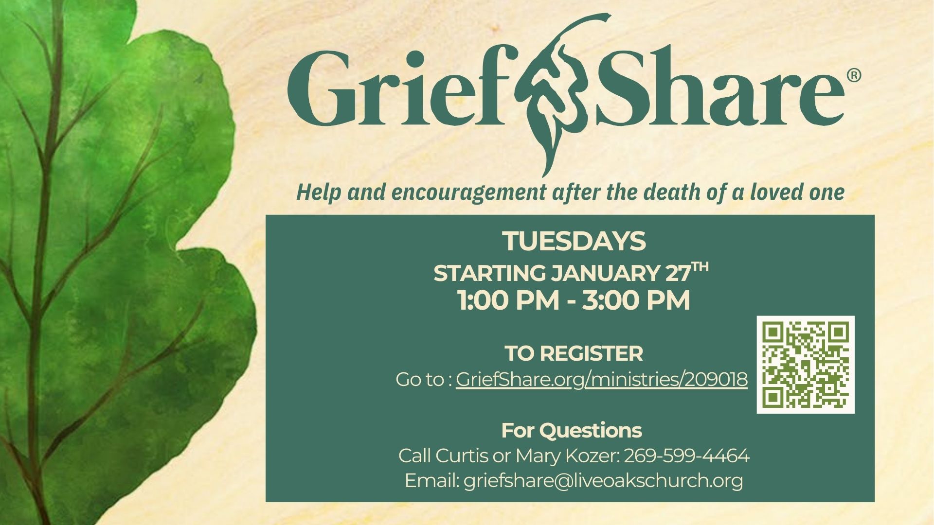 GriefShare: 12 Weeks ← BACK TO EVENTS GriefshareDate: 01/27/1026Time: 1:00PM – 3:00 PMLocation: WoodridgeRegister“Your journey from mourning to joy” Join others who have lost a loved one As you begin your healing process January 27 through April 14, 2026 — 13 weeks Tuesday’s, 1:00pm – 3:00pm @ Woodridge campus More LOCC EventsGriefShare: Loss of a Spouse Widows Christmas Tea OCC: Build A Box Blue Christmas Volunteer Sign Ups: The Christmas Gift The Christmas Gift Singles Ministry : Christmas Dinner Thanks-Living Caregiver Support Group Prayer Shawl Crocheters & Knitters Sally2025-12-03T13:44:03-05:00